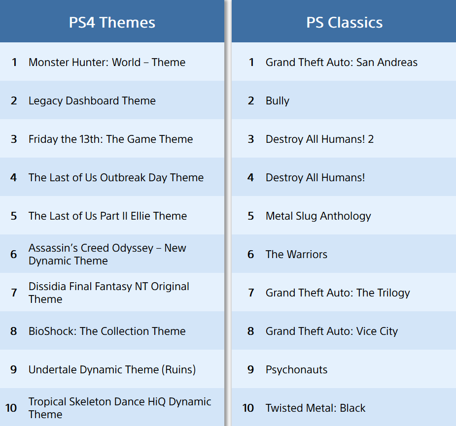 Dari posisi 6 sampai 10, diisi oleh game olahraga NBA 2K19 dan FIFA 19, kemudian game Monster Hunter: World, Far Cry 5, dan terakhir Madden NFL 19. Dexerto menyatakan, dari daftar game terlaris di tahun 2018, ada dua game yang tidak dimasukkan oleh PlayStation, yakni Star Wars: Battlefront 2 dan Battlefield V yang menerima reaksi negatif dari gamers.