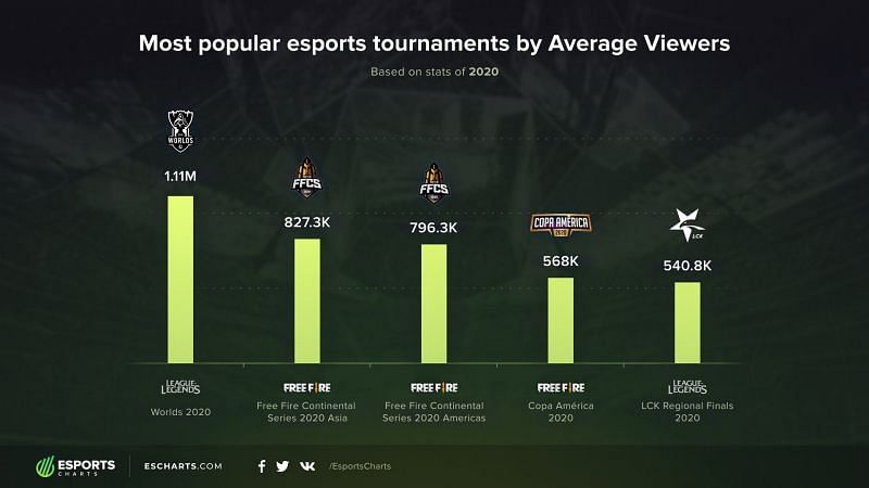 Free Fire mampu mendominasi mobile eSports di tahun 2020. Di daftar peak viewers, diisi oleh turnamen Free Fire Continental Series Asia dan Amerika dengan masing-masing peak viewers sebanyak 2,5 juta dan 1,7 juta.