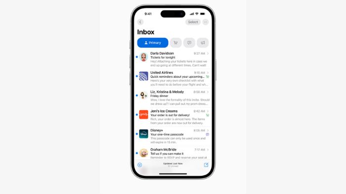 Dalam aplikasi Mail, iOS 18 memperkenalkan fitur kategorisasi yang memungkinkan pengguna untuk dengan mudah mengelola kotak masuk mereka. Pesan penting atau yang mendesak akan dikelompokkan ke dalam kategori Primary, sementara pesan terkait transaksi, pembaruan, dan promosi akan diorganisir dalam tampilan ringkasan yang mudah diakses.