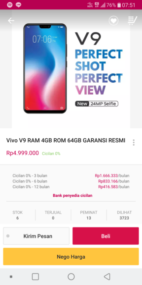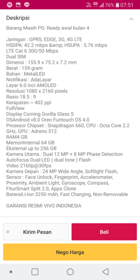 Pada e-commerce tersebut, penjual menggelar pre-order Vivo V9 yang dijual dengan harga Rp 4,9 jutaan. Yang menarik, dalam kolom deskripsi juga terdapat spesifikasi lengkap dari Vivo V9.
