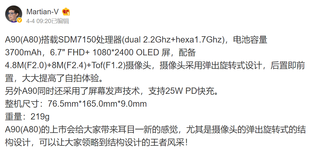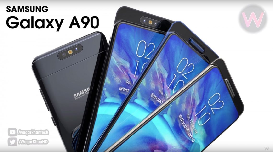 Sebelumnya, desainer grafis Waqar Khan mengunggah video serta foto hasil render yang memperlihatkan rancangan desain Samsung Galaxy A90 dengan layar bezel-less dan mempunyai kamera berputar. Yang menarik, rancangan desain itu diamini oleh seorang leakster terkenal, Ice Universe lewat akun Twitternya @UniverseIce.