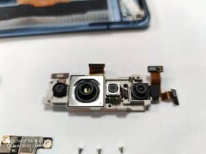 Setelah bingkai kamera belakang dilepas, Anda dapat melihat modul Quad-Camera dari Mi 10. Sensor 108MP pada modul ini tampil menonjol berkat ukurannya yang lebih besar dibandingkan tiga sensor lainnya.