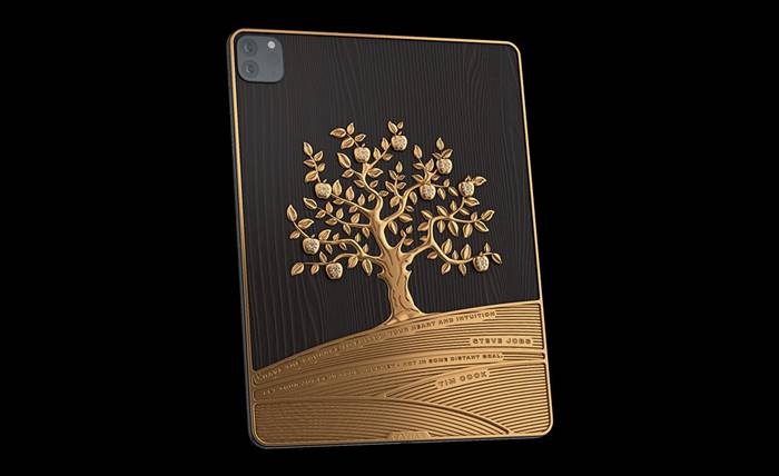 Pohon apel besar ini terbuat dari emas 18 karat seberat 1 kg. Di bagian bawahnya, Caviar menampilkan beberapa kutipan terkenal dari Steve Jobs dan juga bos Apple sekarang, Tim Cook.