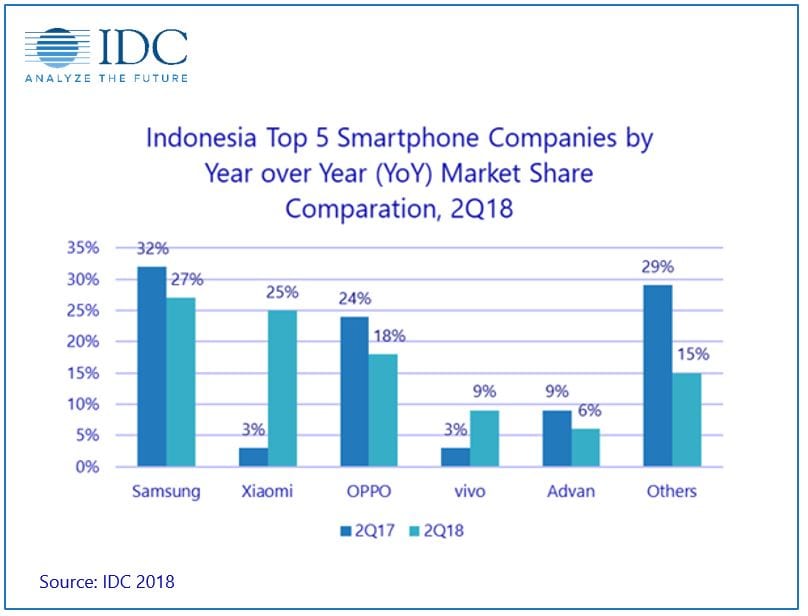 Sedangkan untuk posisi ke tiga dan empat masih dipegang Oppo dan Vivo yang masing-masing memiliki 24% dan 9%. Keduanya memang memiliki konsep dengan kampanye pemasaran yang sangat agresif dan margin keuntungan yang menguntungkan bagi mitra penjualan mereka.