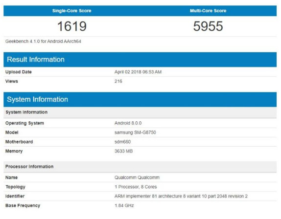 Smartphone ini menjalankan Android 8.0 Oreo, yang mendukung fakta bahwa SM-G8750 adalah perangkat baru yang saat ini sedang mengalami pengembangan. Tidak ada spesifikasi lain yang dapat diperoleh dari Geekbench.