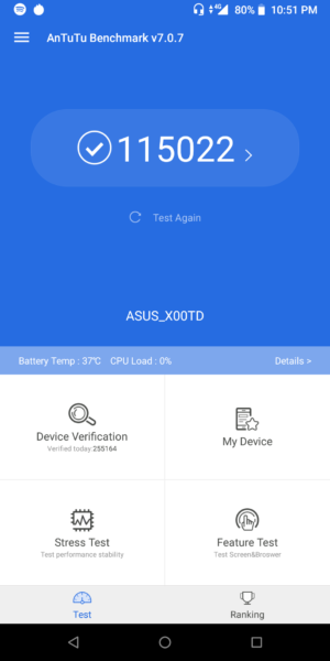 Sebagai bukti, saat itu kami mencoba menjalankan aplikasi benchmark AnTuTu Benchmark versi 7. Hasilnya, Zenfone Max Pro M1 mampu menembus skor 115.022 poin, perolehan bagus untuk smartphone mid-end. Tapi perlu diingat juga, karena berjalan pada sistem operasi Android murni, pada smartphone tak akan ditemukan lagi berbagai aplikasi bawaan Asus yang biasanya muncul di smartphone dengan sistem ZenUI.