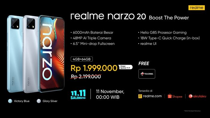 Untuk harga Realme Narzo 20, smartphone ini dibanderol di angka Rp 2.199.000. Anda juga bisa memperolehnya dengan harga spesial Rp 1.999.000 pada event realme 11.11 Salebration pada 11 November jam 00.00 WIB di realme.com, Shopee dan akulaku.