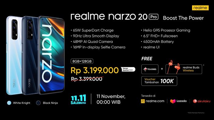 Sementara itu untuk harga Realme Narzo 20 Pro yang punya spesifikasi lebih tinggi dijual Rp 3.399.000. Ada juga harga spesial Rp 3.199.000 yang bisa dapatkan pada flash sale tanggal 11 November mulai jam 00.00 WIB.