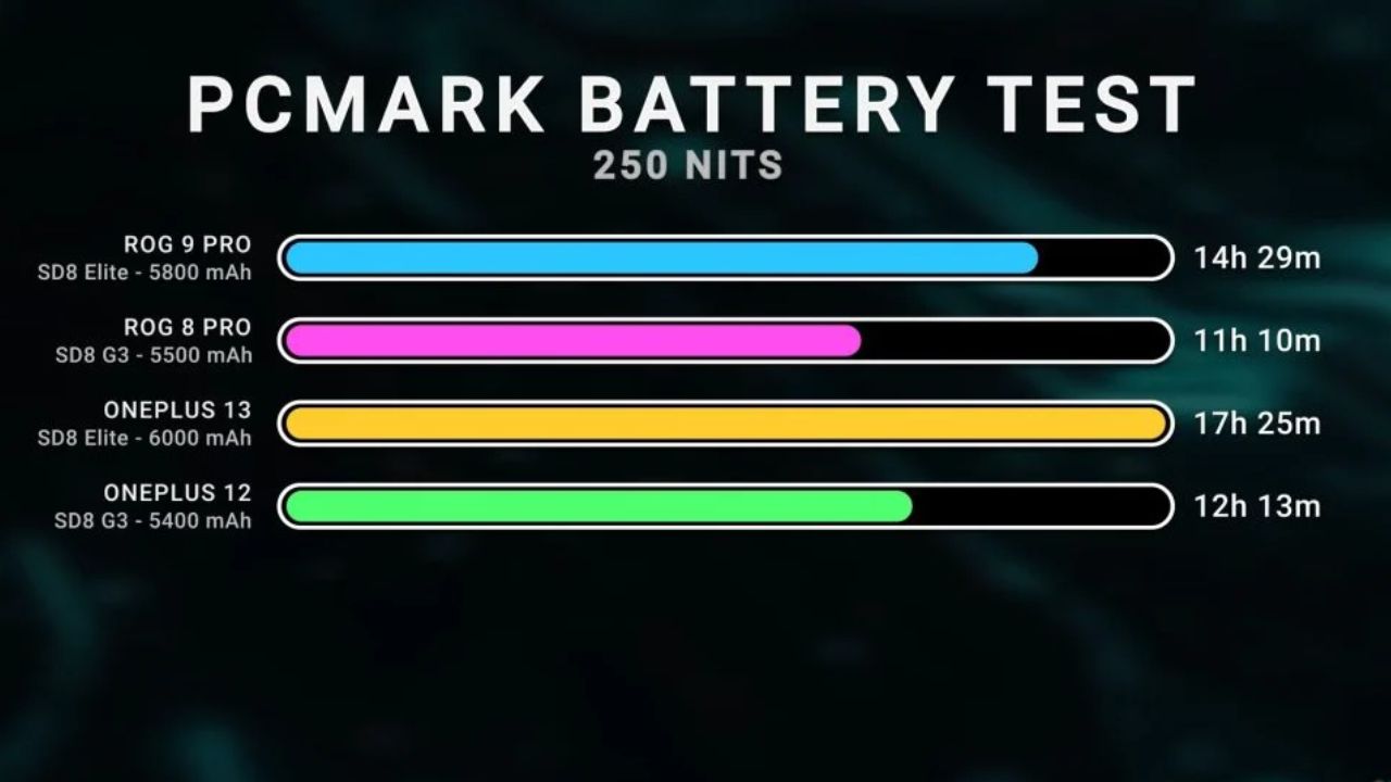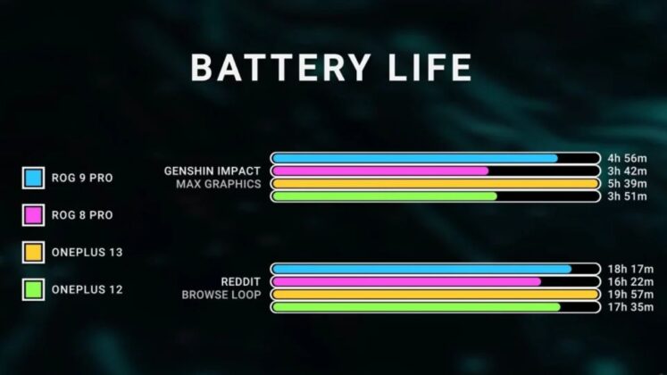 OnePlus 13, dengan baterai 6.000mAh, mampu bertahan selama 17 jam 25 menit. Sementara itu, ROG Phone 9 Pro, yang memiliki baterai 5.800mAh, mencatat waktu 14 jam 29 menit. Dibandingkan dengan model sebelumnya, ini adalah peningkatan masing-masing sebesar 43% dan 30%.