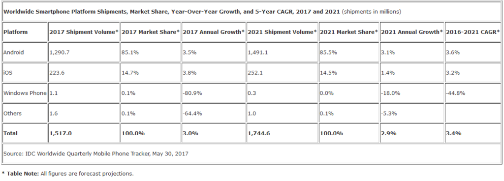 IDC mengungkapkan bahwa pengiriman smartphone global pada 2016 mengalami pertumbuhan dari tahun ke tahun hanya 2,5 persen. Ini merupakan rekor terburuk yang pernah terjadi di industri smartphone dunia. Sementara di 2017, IDC memprediksi akan terjadi pertumbuhan sekitar 3 persen. Itu artinya, IDC meramalkan bahwa 1,52 miliar unit smartphone akan dikirim pada 2017.