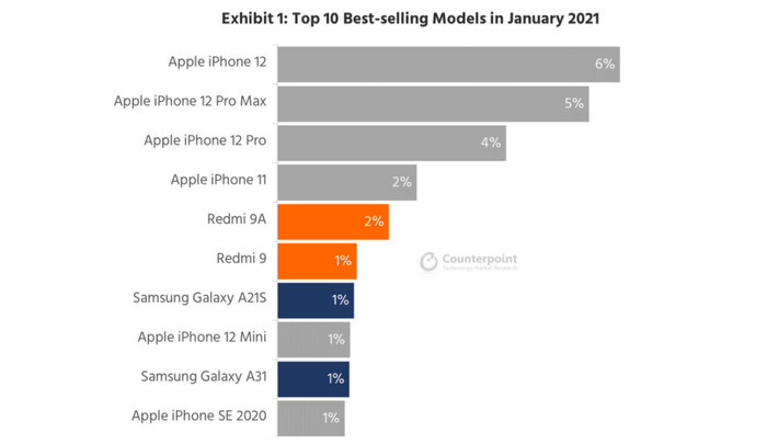 Counterpoint, dalam laporan Market Pulse yang dirilis pada hari Jumat lalu, mengatakan bahwa Apple mendominasi daftar smartphone terlaris, dan meraih sebanyak enam tempat dalam 10 model smartphone terlaris global pada bulan Januari. iPhone 12 memimpin daftar diikuti oleh iPhone 12 Pro dan iPhone 12 Pro Max.