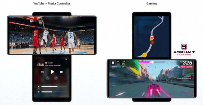 Desain T dari LG Wing ini memungkinkan pengguna menonton satu konten secara horizontal pada layar lebar, sambil melihat konten lainnya dalam posisi vertikal.