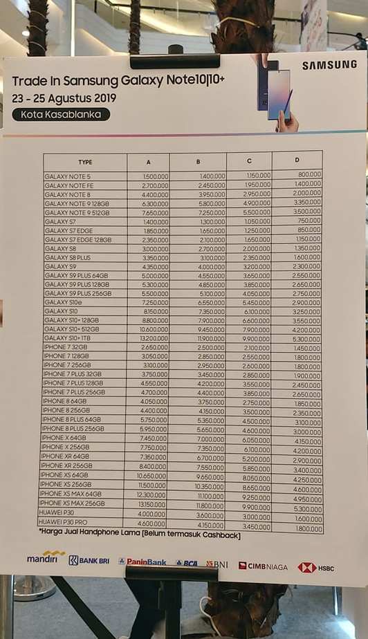 Kemudian untuk Huawei, Samsung hanya menerima Huawei P30 dan Huawei P30 Pro saja. Untuk Huawei P30 Pro, Samsung menghargainya sekitar Rp 4,6 juta, sehingga konsumen perlu menambah Rp 9,3 jutaan. Berikut daftar harga trade in atau tukar tambah di acara Consumer Launch Samsung Galaxy Note 10: