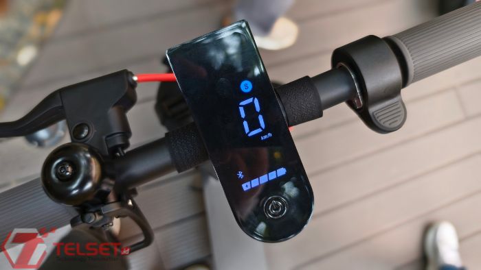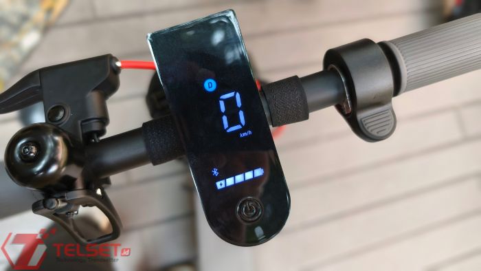 Speedometer skuter ini berbentuk layar LCD yang menampilkan Speed, Battery, Status, dan Mode. Kami mengendarai skuter ini di saat sedang panas-panasnya, alias matahari sedang terik, lalu speedometernya mampu menampilkan indikator dengan jelas tanpa ada redup.