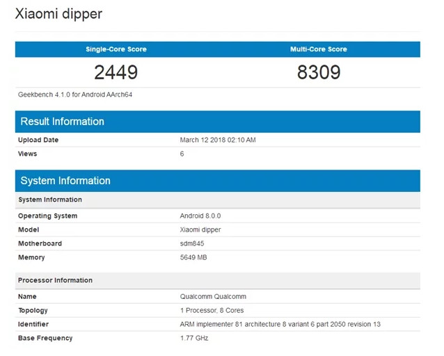 Perangkat yang diberi label sebagai Xiaomi Dipper ini telah muncul di platform benchmarking Geekbench dengan SD845.