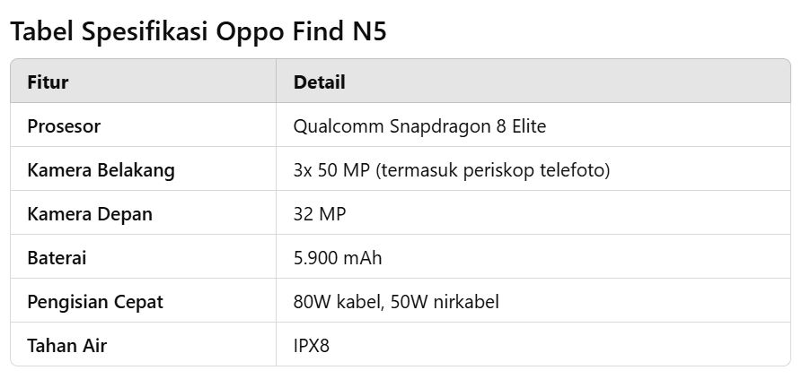 Oppo Find N5 dan OnePlus Open 2 menawarkan kombinasi fitur canggih yang memenuhi kebutuhan pengguna modern, mulai dari kamera berkualitas tinggi hingga daya tahan baterai unggul. Dengan Snapdragon 8 Elite sebagai otak utama, perangkat ini siap bersaing di pasar ponsel lipat premium pada 2025.