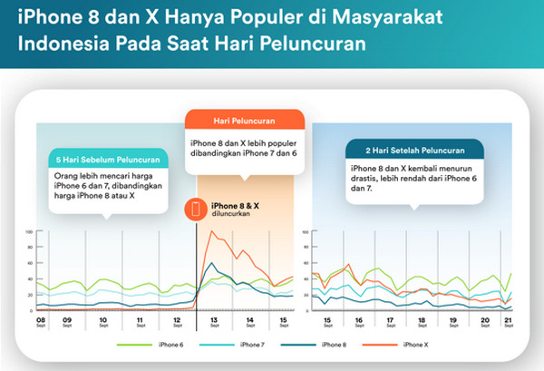 Popularitas iPhone 8 dan X meningkat tajam pada tanggal 13 September di Indonesia. Hal ini sudah dapat diprediksi karena hari itu Apple meluncurkan iPhone terbaru mereka, sehingga banyak masyarakat Indonesia yang penasaran akan harga yang mereka tetapkan untuk produk-produk ini.