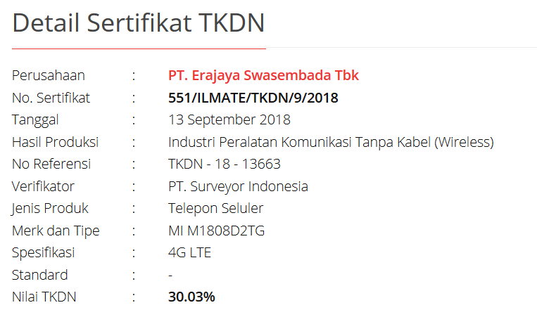 Pada situs resmi P3DN, perangkat dengan nomor MI M1808D2TG itu telah lulus TKDN dengan persentase sebesar 30,3% pada tanggal 13 September 2018. Sertifikasi itu diajukan oleh PT Erajaya Swasembada, perusahaan yang menaungi toko ritel Erafone.