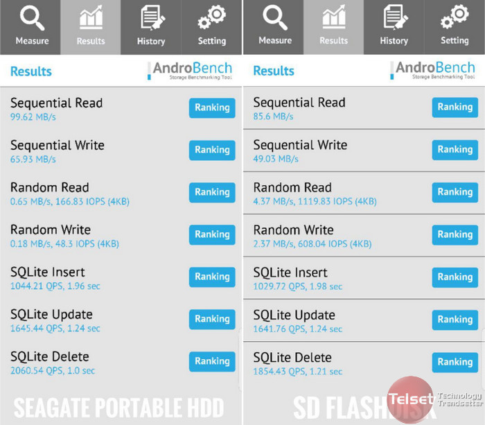 Uji langsung dari PC menggunakan aplikasi Androbench. Ternyata hasilnya, Seagate portable HDD ini secara angka sequential read dan write sangat baik. Sebagai pembanding diuji juga flashdisk SanDisk, dan ternyata hasil sequential read dan write-nya lebih bagus di Seagate portable.