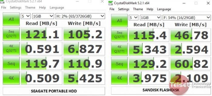 Untuk lebih membuktikan hasil uji, Seagate Portable ini diuji juga menggunakan laptop dengan aplikasi Crystal Disk Mark, hasilnya memang ternyata sequential read dan write-nya memang lebih cepat dibanding flashdisk Sandisk yang sudah masuk kategori cepat.