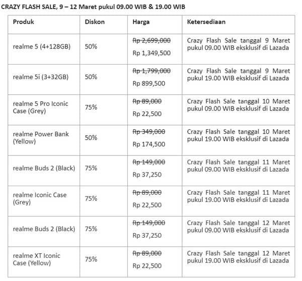 realme 5i juga akan mendapatkan diskon 50% selama Crazy Flash Sale menjadi Rp 899.500 dari harga normal Rp 1.799.000. Pelanggan juga bisa mendapatkan diskon 75% berlaku untuk pembelian realme Buds 2 dan realme Iconic Case. [HR/HBS]