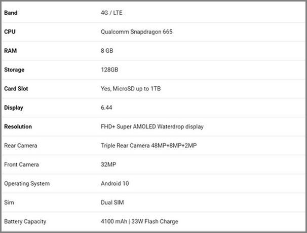 Dapur pacunya ditenagai prosesor octa-core Qualcomm Snapdragon 665 SoC, yang dipasangkan dengan RAM 8GB, dengan penyimpanan internal 128GB.