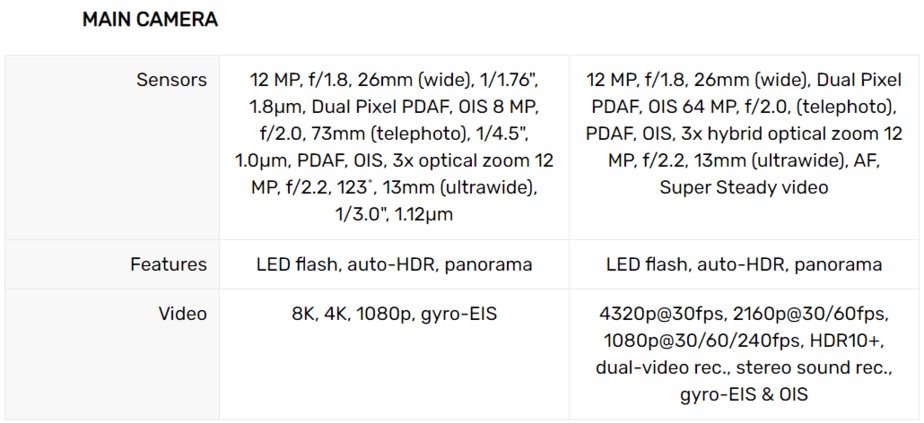 Kedua ponsel sama-sama mengandalkan tiga kamera belakang dan satu kamera depan. Galaxy S20 FE punya lensa utama 12MP, kamera ultrawide 12MP, dan kamera telephoto 8MP dengan kemampuan 3x optical zoom dan Space Zoom (digital) 30x.