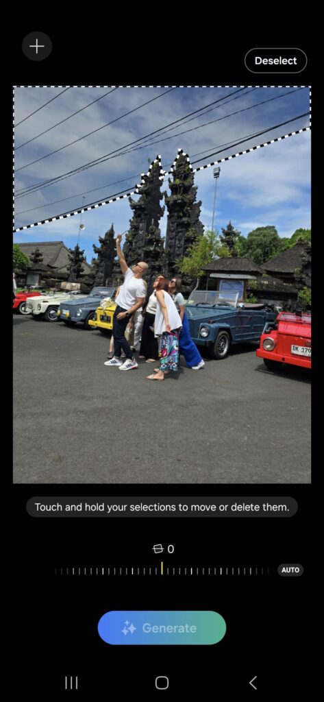 Inilah saatnya fitur generative edit pada Galaxy S24 beraksi. Saya menemukan sebuah foto yang sempurna kecuali satu elemen yang mengganggu. Dengan Samsung Galaxy S24, saya tidak perlu khawatir. Proses menghilangkan objek yang tidak diinginkan dari foto berlangsung begitu mudah dan cepat.