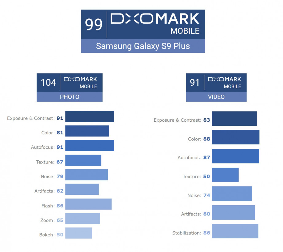 Samsung Galaxy S9+ berhasil mencatatkan skor nyaris sempurna, tepatnya 99 poin. Mengalahkan Google Pixel 2 yang hanya memperoleh 98 poin dan iPhone X dengan 97 poin.