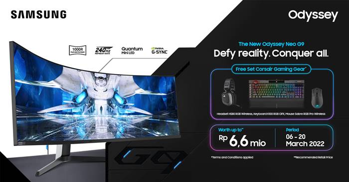 Samsung Odyssey Neo G9 (G95NA) tersedia untuk preorder pada tanggal 6-20 Maret 2022 di toko online Samsung.com/id, JD.id, Blibli.com, Tokopedia dan Shopee Samsung Monitor Official Store.