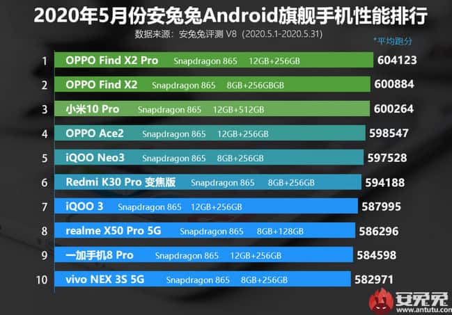 Untuk AnTuTu versi China, daftar peringkat smartphone terkencang di bulan Mei 2020 dikuasai oleh Oppo. Oppo Find X2 Pro menjadi yang tercepat di bulan Mei dengan skor 604.123 poin, berkat sokongan chipset Snapdragon 865.