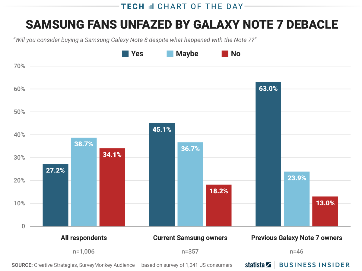 Tak luput juga mereka melakukan survei ini terhadap para pengguna Samsung. Hasilnya, sebanyak 45,1 akan membeli Note 8, sedangkan 36,7 persen pengguna Samsung masih ragu dengan phablet tersebut. Cuma 18,2 persen yang mengatakan tak berminat.