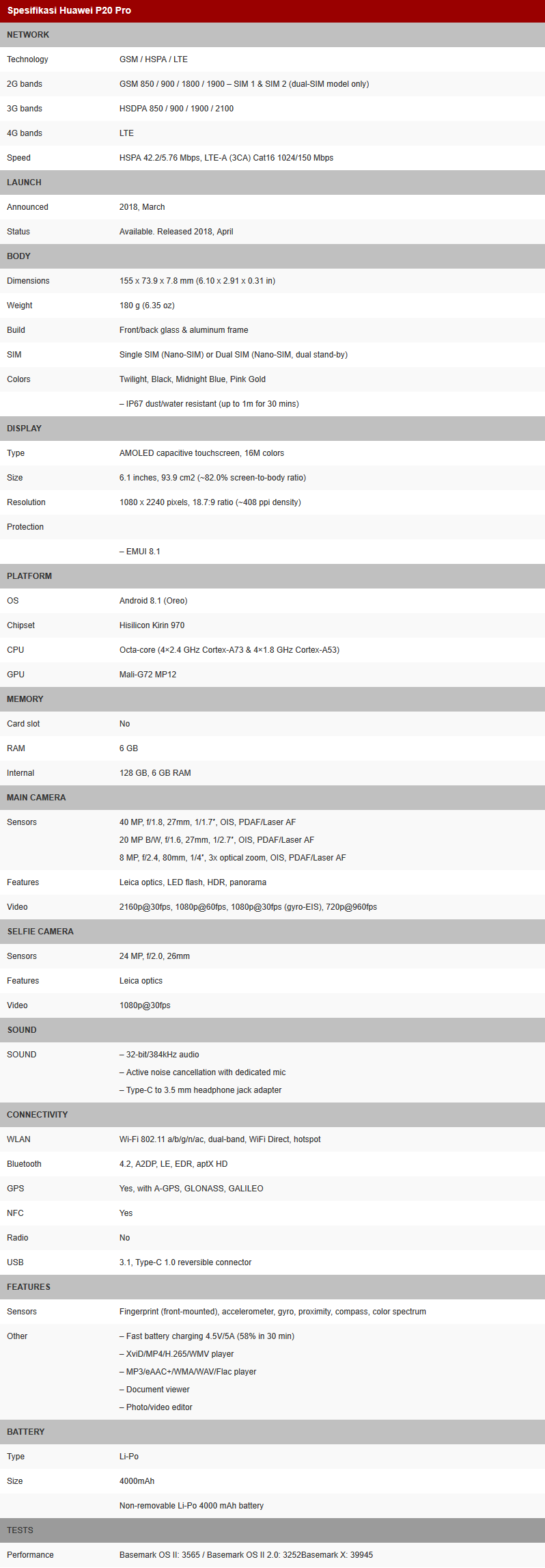 Untuk spesifikasi secara keseluruhan, Huawei P20 Pro mengusung layar memanjang berukuran 6,1 inci beresolusi FHD+ dengan aspek rasio 18,7 : 9. Smartphone tersebut ditopang oleh mesin utama high-end dan berkemampuan tinggi. P20 Pro ditenagai oleh prosesor octa-core 2.4 GHz HiSilicon Kirin 970, GPU Mali G72 MP12, RAM 6GB, ROM 128GB, dan baterai berkapasitas 4,000 mAh.