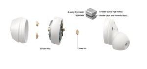 Earbuds terbaru Samsung ini memilik dimensi 17.5 x 22.5 x 19.2mm dengan bobot 6.3g. Dilengkapi dengan charging case, yang memiliki ukuran 38.8 x 70 x 26.5mm dengan bobot 39.6g.