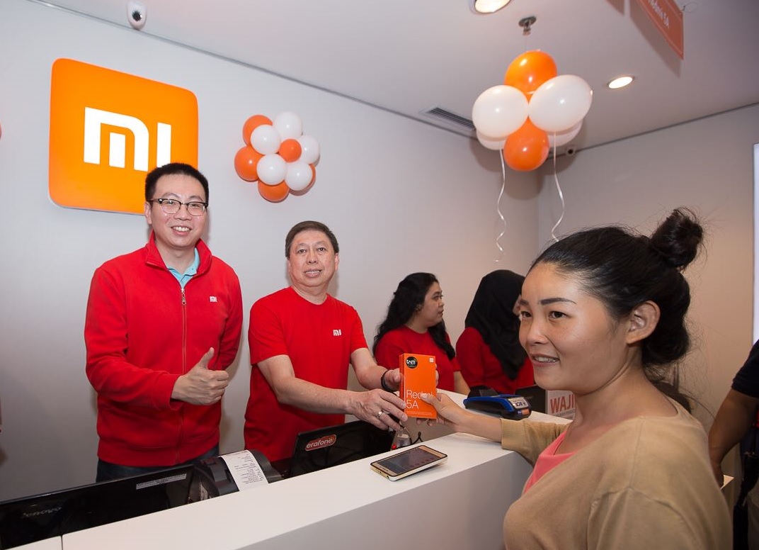 Steven Shi, Head of Xiaomi South Pacific Region and Xiaomi Indonesia Country Manager bersama Hasan Aula, CEO Erajaya Group terlihat sedang melayani dan memberikan informasi produk kepada beberapa pelanggan pertama yang hadir pada pembukaan Authorized Mi Store Mal Kelapa Gading 1.