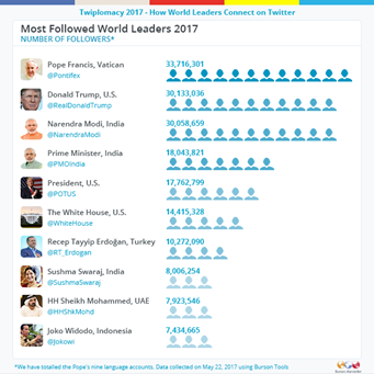 Sedangkan Presiden Indonesia, Joko “Jokowi” Widodo, merupakan salah satu tokoh dunia yang berpengaruh di jejaring sosial. Dengan 7,4 juta pengikut di Twitter, Jokowi (@jokowi) merupakan pemimpin dunia dengan pengikut terbanyak ke-10 di Twitter.