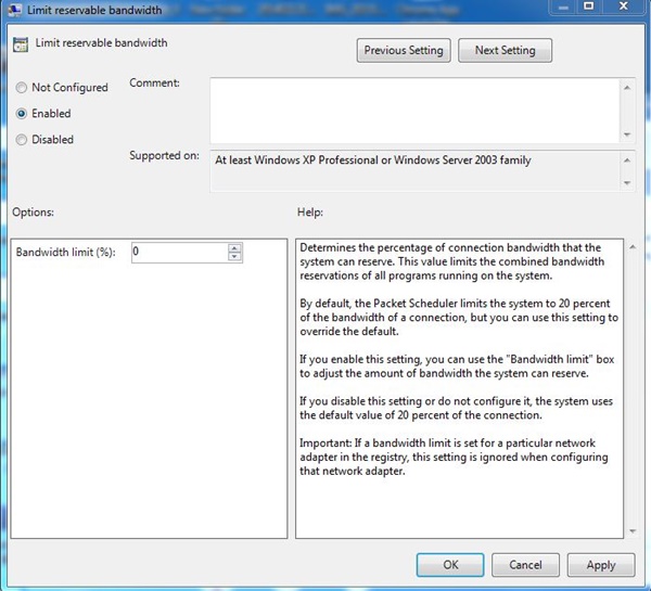 - Selanjutnya, klik dua kali Limit Reservable Bandwidth. Jika sudah muncul halamannya, ubah pengaturannya menjadi Enabled dan atur bandwidth limit menjadi 0, kemudian tekan Ok.