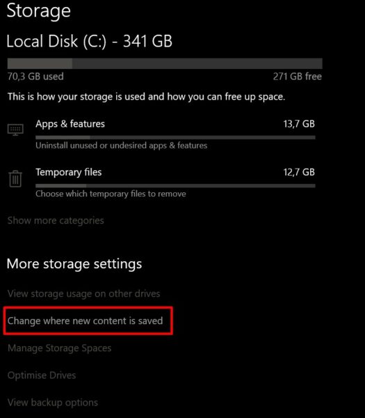 Kemudian, pilih Storage. Lalu tekan menu Change where new content is saved. Di bagian New apps will save to:, pilih drive lain untuk menyimpan aplikasi Anda.