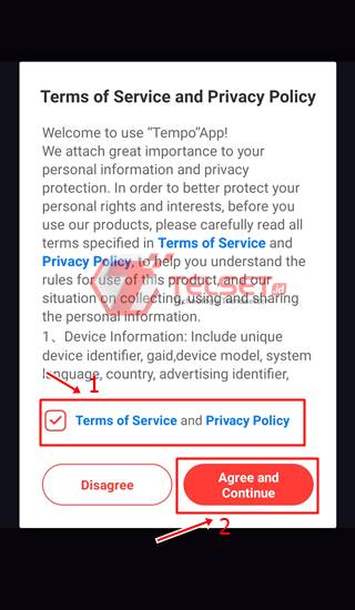 - Baca semua ketentuan mengenai aplikasi, lalu berikan tanda centang pada Terms of Service and Privacy Policy kemudian Agree and Continue.