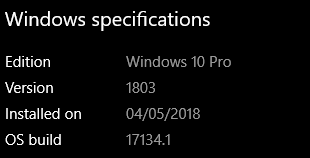 - Pertama-tama, pastikan sistem Windows 10 Anda telah mendapatkan pembaruan terbaru dari Microsoft. Untuk mengetahuinya, masuk ke Settings > System > About dan pastikan Windows 10 sudah versi 1803 dengan OS build 17134.1.