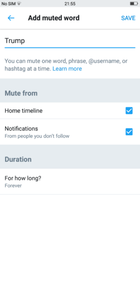 - Selain bisa memasukkan kata-kata, Anda pun bisa memilih ingin memblokirnya dari timeline, notifikasi ataupun keduanya. Selain itu waktu pemblokiran yang bisa dipilih beragam, dari 24 jam, satu minggu, 30 hari hingga selamanya. Jika sudah, tekan tombol Save.