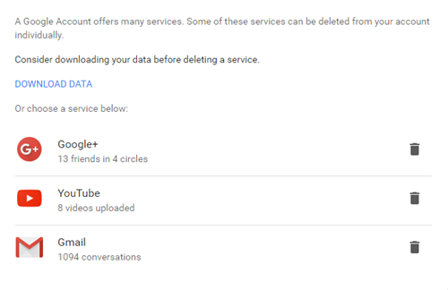 - Kemudian, akan muncul halaman layanan Google yang Anda gunakan seperti Google+, YouTube atau Gmail. Nah untuk menghapusnya, tekan saja tombol berbentuk tempat sampah di sebelah kanan layanan tersebut.