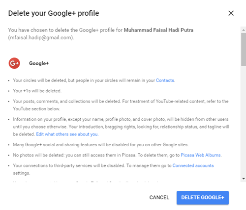 - Ketika sudah memutuskan ingin menghapus layanan Google, setelah menekan tombol, maka akan muncul halaman popup dan tekan tombol Delete Google+ (kami mencoba untuk menghapus akun Google+) untuk menghapusnya.