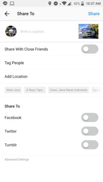 - Namun ketika masuk ke bagian Share To atau halaman untuk memasukkan caption, tag seseorang, menambahkan lokasi, dan lainnya, tekan tombol Advanced Settings di bagian paling bawah.