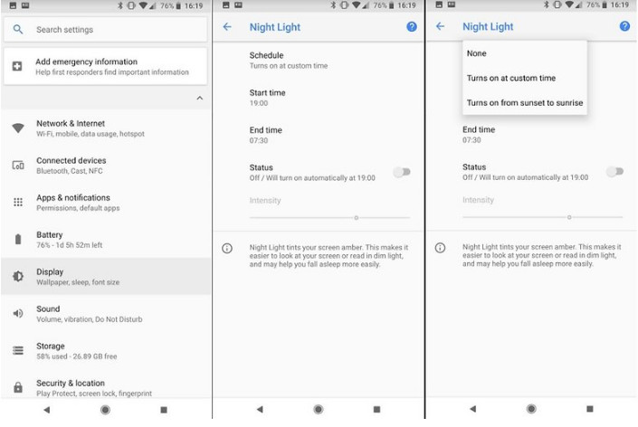 Untuk beberapa ponsel dari produsen lain mode malem ini ternyata sudah diterapkan jadi tidak menunggu pembaruan versi Android berikutnya. Ini untuk beberapa brand seperti Honor, Huawei, Asus, OnePlus, Samsung. Umumnya, yang perlu Anda lakukan hanya pergi ke Pengaturan> Pengaturan Layar > fitur Blue Light Filter atau Screen Mode.