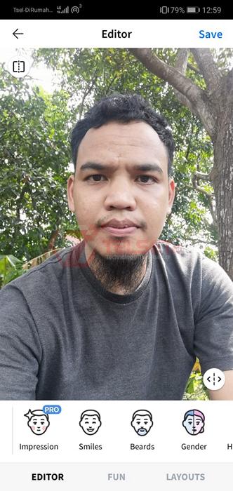 – Pilih filter sesuai keinginan anda pada Tab Editor. Pilih beberapa filter permak wajah yang tersedia. Aplikasi ini bisa mengubah foto wajah untuk setiap bagian, seperti bibir, gaya rambut, warna rambut dan juga rambut wajah.