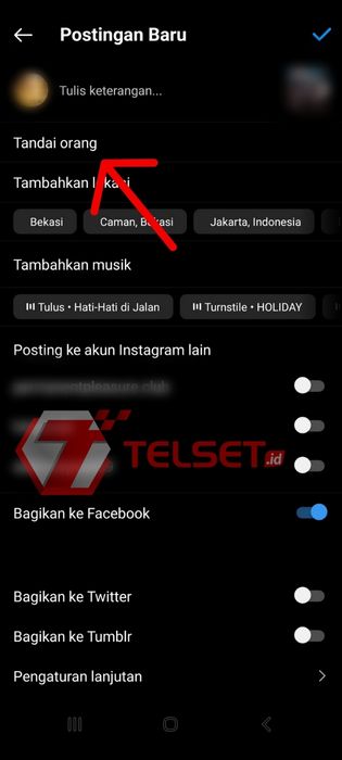 - Sehabis itu, kalian masuk ke pengaturan postingan baru dan kalian bisa langsung klik tandai orang.