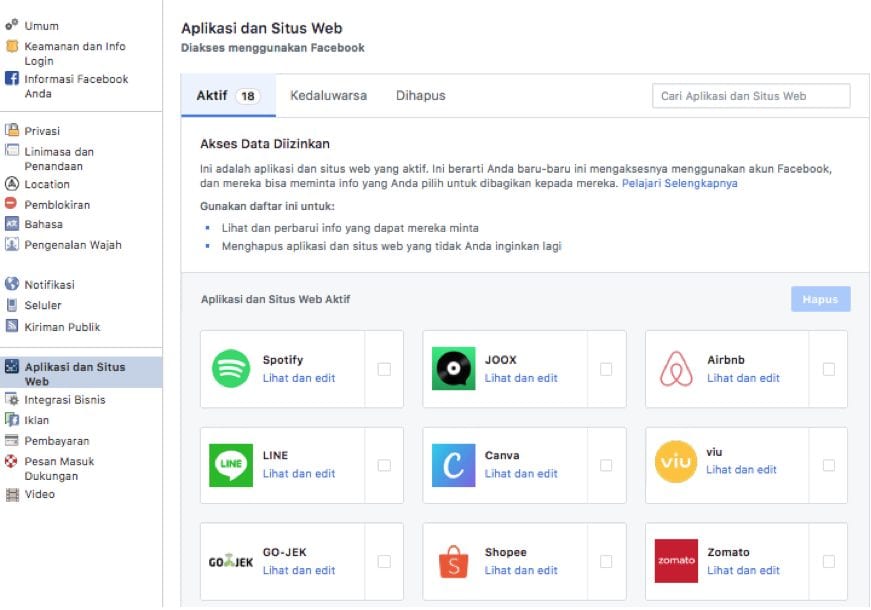 Tinjau aplikasi apa saja yang terhubung dengan akun Facebook Anda