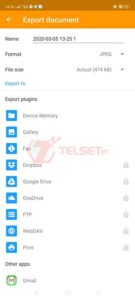 5. Simpan dokumen yang telah di scan tadi, dengan cara klik tombol share yang ada di sudut kanan atas. Setelah itu pilih format yang anda inginkan apakah PDF atau JPEG, lalu export ke penyimpanan memori smartphone. Atau kalian juga bisa mengirim langsung dokumen tersebut melalui email.