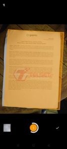 3. Letakan dokumen yang ingin anda scan di depan kamera smartphone andaAkan ada area berwarna orange yang menandakan area yang dipindai pada dokumen. Secara otomatis area berwarna orange akan mendeteksi dokumen yang ingin di ambil. Lalu klik tanda centang yang ada di kanan.